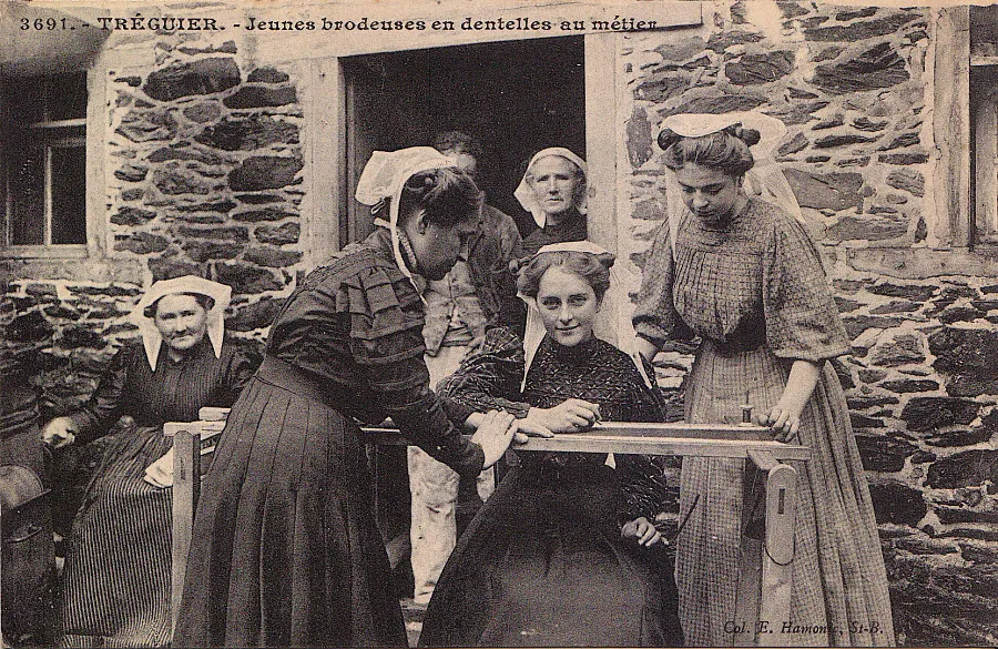 Postkort - Lunévilleuse - Frankrig omkring 1920 nær Nancy og byen Lunéville hvor broderimester Monsieur Lunéville opfandt perletamburering i 1867. Seks tusind var i dette område beskæftigede med perletamburering af bl.a Charlestoneskjoler.