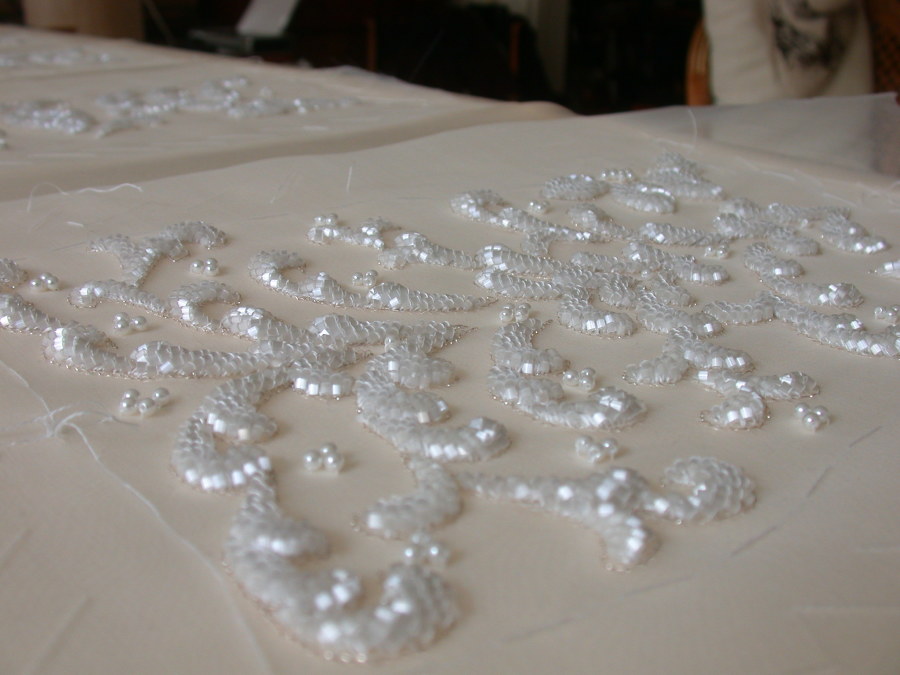 Tambour beading / Lunéville technique in high relief on silk satin